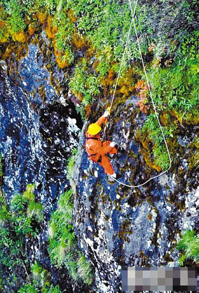 ■清晨7點,彭文才帶著專業攀岩設備,在崖邊清潔。網上圖片