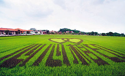東莞東城區周屋水稻基地中的稻田近日出現了「心心相印」字樣,這幅稻田畫引起網友爭相拍照留念。這片「心心相印」創意稻田面積約3畝,種有紫、黃、綠三種顏色的水稻,圖案由兩個交疊相印的心形和「心心相印」四個大字組成。其中,兩個心形的邊線及下方的文字為紫色水稻,心形的中心部分為黃色水稻,圖案背景則是常規綠色水稻。 ■本報記者 何花 東莞報道