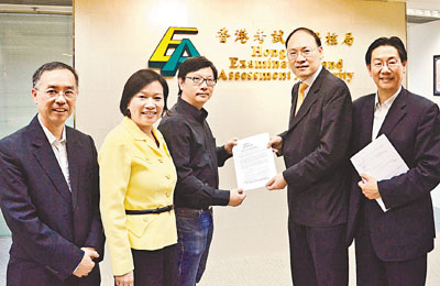 ■梁美芬(左二)提出取消通識科考試中的必答題,及增加校本評核的比例。圖為關注通識教育聯席會議與考評局會面。梁美芬議員辦公室提供圖片