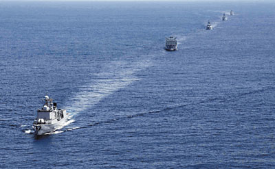 根據航線圖顯示,在趕赴西太平洋演習海域途中,由「廣州」號、「黃山」號、「微山湖」號組成的南海艦隊參演編隊拐了一個彎,沿著一條「U」形航線機動,多走了兩倍路線。這是因為,這條航線上設置了多達10處演習區域。編隊先後進行了單艦綜合操演、反潛、防空、防水雷、防核化等演練。