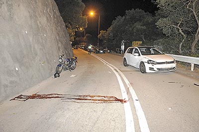 ■鐵騎士越線迎撼私家車後拋飛撞山坡身亡,路面遺下一條「血路」。