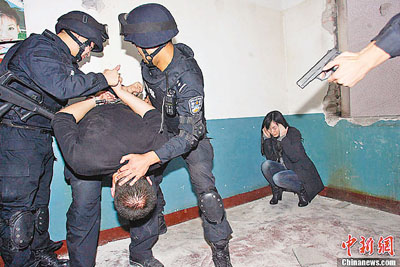 在三峽工程所在地湖北宜昌,當地公安局特警支隊為豐富實戰經驗,7日下午開展了保衛三峽大壩反恐演練。圖為特警擒獲「劫匪」救出「人質」。 中新網