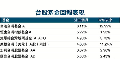 以佔近三個月榜首的富達台灣基金為例,主要是透過台灣公司的證券管理組合。該基金在2010年、2011年和2012年表現分別為12.31%、-28.23%及20.18%。上述基金的資產行業比重為54.4%資訊科技、15.7%金融業、12.7%必需品消費、7.9%工業、4.4%基本物料、1.8%必需品消費、1.2%電訊服務及0.8%健康護理。