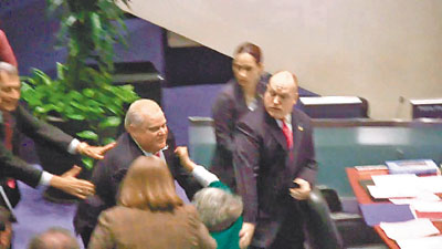 議員辯論期間,有反對者在公眾席叫囂,福特直斥他們是「流氓」。他試圖跑到會議廳另一邊時,意外撞倒麥康奈爾,他隨即扶起對方,她並無受傷。