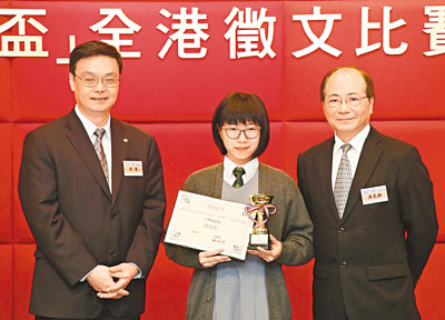 ■吳克儉(右)和李魯(左)頒獎予中學組冠軍、嗇色園可風中學中六生林嘉曦(中)。潘達文 攝