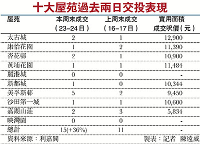 香港文匯報訊(記者 陳遠威)因樓市焦點仍放在一手新盤,二手屋苑成交仍在低位徘徊。據三大地產代理統計,本周末錄得十大屋苑成交個案介乎9宗至15宗。其中,中原錄得9宗成交,與上周相同,當中6個屋苑「捧蛋」;美聯回落2宗至12宗;利嘉閣則錄得15宗,較上周末增加4宗,惟仍處於低水平。