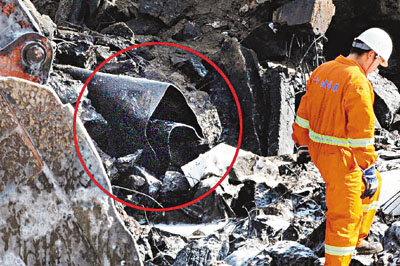 ■引發爆炸的711MM輸油管道疑似漏油點被找到。紅圈處為斷裂的輸油管道。 新華社