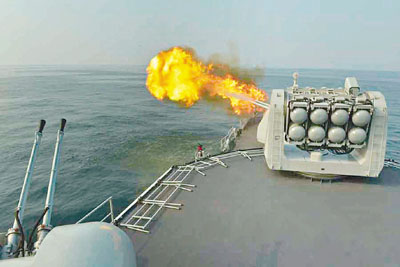 ▲紅藍對抗,海軍宜昌艦首次使用主炮發射100MM箔條干擾彈。 網上圖片