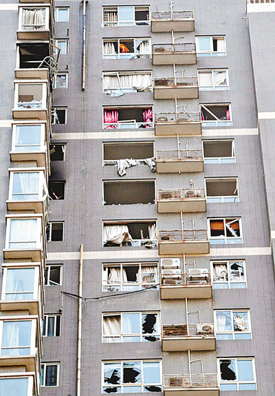 ■事發大樓多樓層窗戶被炸裂。本報西安傳真