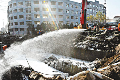 ■消防官兵在爆炸現場齋堂島街北口作業點噴灑泡沫滅火劑,阻隔油面接觸空氣,以防發生次生災害。 新華社