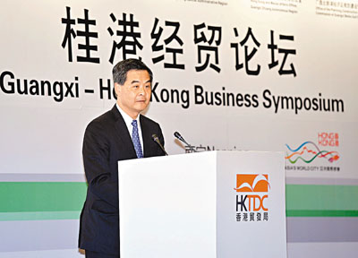 梁振英昨日率領近100位香港經貿代表出席「2013廣西香港經貿合作交流會」,與彭清華及300多位廣西企業代表共同探討桂港兩地的合作機遇。