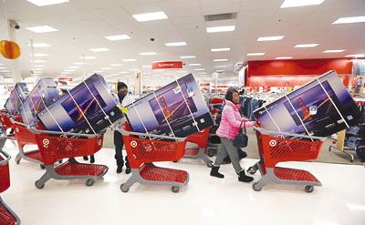 「黑色星期五」的風氣亦吹至英國。當地連鎖超市Asda仿傚美國零售商,昨日進行減價推廣,包括把平板電腦售價降至42英鎊(約532港元),42吋大電視減至259英鎊(約3,278港元),令全國約350間店舖在開門前已出現人龍。 ■路透社/美聯社/《華盛頓時報》/英國《金融時報》/彭博通訊社