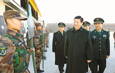 習近平28日來到濟南軍區兵種訓練基地,實地察看軍區直屬隊新兵團訓練情況。9時許,習近平等來到射擊預習場,登上觀摩台,觀看新戰士刺殺基本動作、自動步槍精度實彈射擊和單兵戰術基礎動作對抗訓練。看到他們良好的軍事技能,習近平頻頻點頭。習近平還察看了實彈射擊的胸環靶,表揚新戰士取得了好成績。