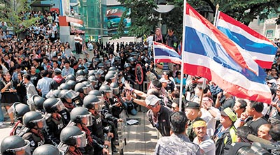 泰國的反政府示威愈演愈烈,約千名示威者昨日一度闖入泰國皇家陸軍總部,促軍方表態,要求軍方加入他們推翻政府的行動。另外,約千名示威者昨早在沙沒巴干府市政廳與約300名親政府的「紅衫軍」發生衝突;紅衫軍領袖乍都蓬指,示威者計劃綁架總理英祿及其他政府領袖。英祿前日伸出欖橄枝,建議與示威領袖素貼對話但遭拒,而英祿表明不會提早大選。