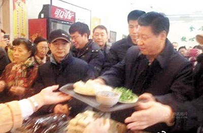 ■習近平昨日在北京慶豐包子舖排隊買包,自己買單、端盤、取包,盡顯親民作風。 網上圖片