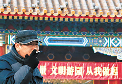國家衛計委新聞發言人毛群安1日表示,衛生計生部門將推動創建無煙環境,提供戒煙服務。圖為市民在景山公園外抽煙。中新社