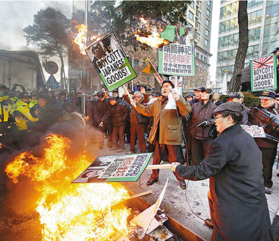 ■安倍拜鬼激起多國不滿,韓國民眾早前焚燒安倍肖像抗議。 資料圖片
