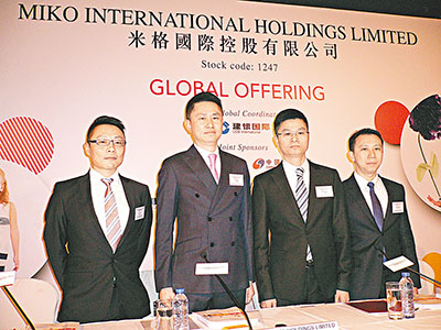 ■米格上市前暗盤表現造好,據耀才新股交易中心顯示,該股收報3.5元,升53.5%,不計手續費賺2,440元,賺錢能力遠勝去年暗盤「賺錢王」福壽園的最多1,870元。圖為米格管理層較早前出席上市記者會。 資料圖片