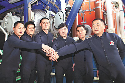 ■參加中國首次300米飽和潛水作業的6名飽和潛水員在潛水鐘前合影。資料圖片