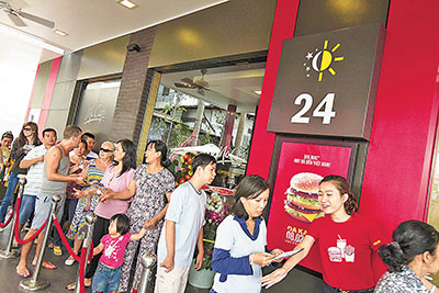 越戰結束40年後,美國連鎖快餐店麥當勞終進軍越南,位於胡志明市的首間分店昨開業。為一嚐巨無霸的滋味,數百人在店外大排長龍。總理阮晉勇的女婿阮寶黃是麥當勞踏足越南的合作夥伴,他昨日亦親力親為,在店外指揮交通。