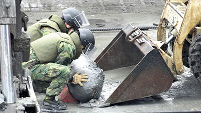 香港文匯報訊 台北巿信義區世貿二館原址工地昨日挖出未爆大炸彈,引起一陣恐慌,警消人員立即封鎖現場,軍方並派員利用鏟土機將未爆彈抬起運走,過程順利未釀災害。