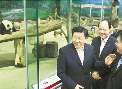 ■昨日,海基會董事長林中森(左2)陪同海協會會長陳德銘(左)在台北市立動物園看大熊貓「圓仔」。中央社