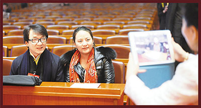 全國政協十二屆二次會議昨日舉行第三次全體會議前,一名參會的女性找到成龍合影留念。 中新社