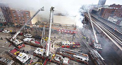 紐約消防派出250名消防員到場救援,其後將事故升為5級。有住客表示,大廈內一間琴行最先起火,之後引發爆炸,又指幾日前已聞到現場傳出氣味,疑是氣體洩漏。