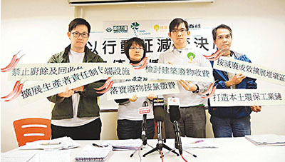 綠領行動、香港地球之友、長春社、綠色力量四個環團昨日舉行聯合記者會,要求政府向立法會申請擴建堆填區及焚化爐撥款前,應先出6項推動「源頭減廢」的措施,包括在2016年或之前落實都市固體廢物徵費;不遲於2018年將生產者責任制擴展至多種物料;及馬上檢討建築廢料收費計劃等,才推行擴建堆填區及興建焚化爐等末端處理設施。