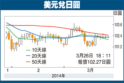 另一方面,日本將於下周二開始把銷售稅提高至8%,投資者亦較為擔憂日本第2季經濟將有掉頭收縮風險,使美元兌日圓近期升勢放緩。因此除了日本央行行長黑田東彥率先在上周五表示將維持超寬鬆貨幣政策,盡力達至2%的通脹目標,令美元兌日圓本周初重上102.65附近之外,近日安倍晉三的經濟顧問本田悅朗認為日本央行將可能早至5月便決定是否推出新的刺激經濟措施,均對美元兌日圓的跌幅構成一定限制,反映日本1月核心通脹按年上升1.3%,連續8個月攀升後,日本財金官員已略為憂慮銷售稅的調升將會抑制通脹率的升勢。受到美國聯儲局將在今年結束購債,同時日本財金官員仍繼續發出不利日圓的言論影響,預料美元兌日圓將反覆走高至103.40水平。