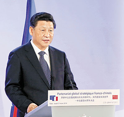 習近平回顧了中法兩國建交50年的歷史和過去,感謝毛澤東和戴高樂兩位偉人做出的建交決策,使得中法關係成為世界大國關係中的一對特殊關係,始終走在中國同西方主要發達國家關係前列。