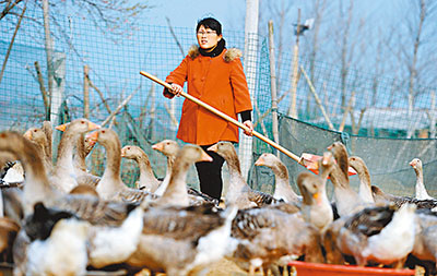 昨日,淮北職業技術學院畢業生房小娜在大雁養殖場裡給大雁餵食。她在沱湖邊創辦了大雁養殖專業合作社,如今,房小娜的大雁養殖已經初具規模,在地建立了30多家聯營商戶。 新華社