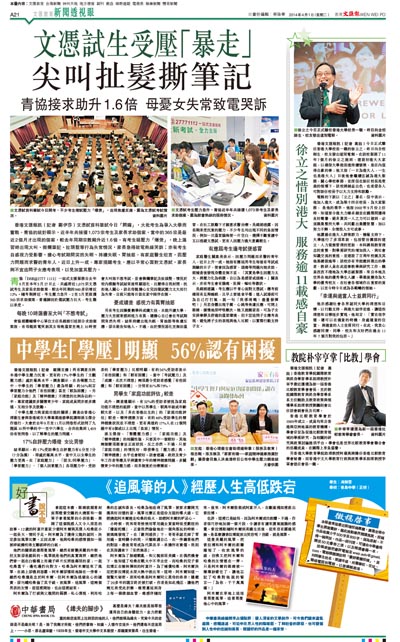 香港文匯報訊(記者 鄭伊莎)文憑試首科筆試今日「開鑼」,大批考生為爭入大學而奮戰。青協的統計顯示,近半年共接獲1,073宗考生及家長求助個案,當中的365宗是最近2個月才出現的個案,較去年同期宗數C升近1.6倍。有考生疑壓力「爆煲」,晚上溫習時出現大叫、撕爛筆記、扯頭髮等行為失常情況,家長急得致電熱線哭訴;亦有考生自感視力受影響,擔心考試期間突然失明、持續失眠、胃抽筋。有家庭醫生坦言,因壓力問題而求醫的青年人,近日上升一成。專家提醒考生,應以平常心面對文憑試,家長則不宜追問子女應考表現,以免加重其壓力。