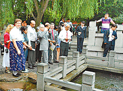 ■圖為外國友人參觀趵突泉公園。資料圖片