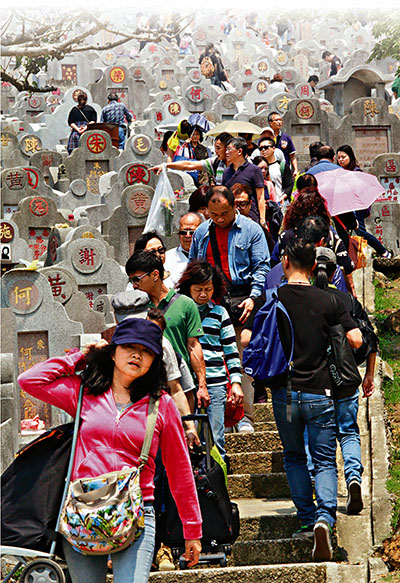 ■百行以孝為先,昨日大批孝子賢孫趁清明節,帶同三牲祭品上山祭祖,冀藉燒衣灑酒向先人表達心意。彭子文 攝