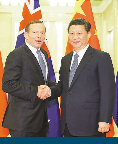 ■習近平昨日在北京人民大會堂會見澳洲總理阿博特,感謝澳方協助搜尋失聯馬航。 中新社