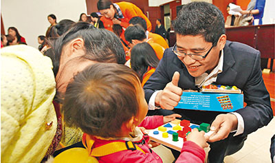 ■愛心志願者與殘疾兒童互動做遊戲。 許甜甜 攝