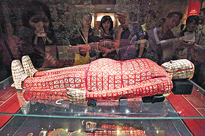 南越王墓(又稱南越王博物館)鑿山而建,秘埋在象崗山頂之下20米的腹心深處,建墓所用的750多塊石料為紅砂岩,採自距廣州20海里的蓮花山。越王墓共出土印璽23枚,質料有金、銅、玉、水晶、瑪瑙、綠松石和象牙7種;出土各式玉器244件,包括絲縷玉衣、角形玉杯、71塊玉璧、11組套玉珮、58件玉劍飾等。圖為南越王博物館中展出的絲縷玉衣。