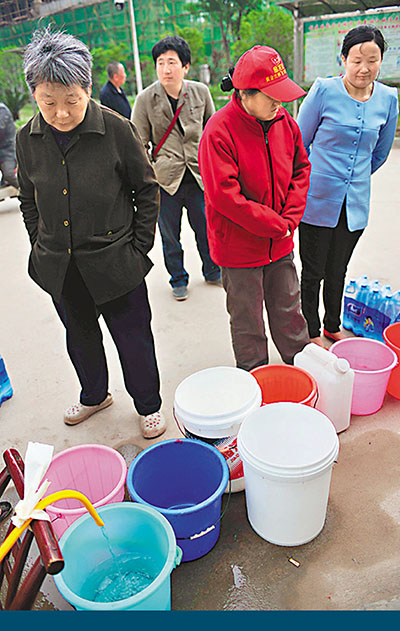 ■漢江污染影響供水,武漢居民排隊載水。 新華社