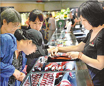 ■陸客對購物情有獨鍾。圖為遊台陸客選購珊瑚飾品。資料圖片