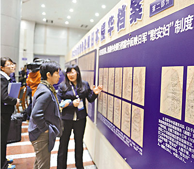■參觀者在觀看反映「慰安婦」情況的日本侵華檔案影印件。 中新社