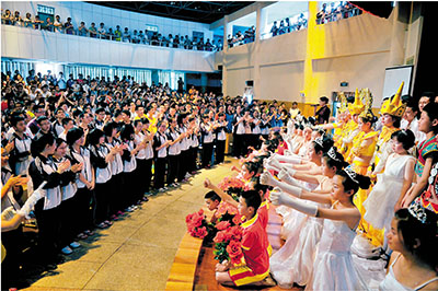 昆明盲啞學校藝術團的學生於24日走進雲南昆明市第一中學,用「無聲」勵志演出,為千餘高考生加油鼓勁,放鬆減壓。演出結束後,掌聲經久不息。 中新社