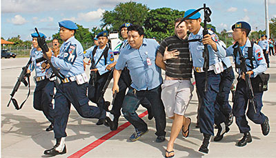 ■ 大批警方拘捕克里斯托弗,將他帶離客機。 法新社