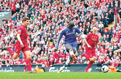 英超「紅藍大戰」昨晚舉行,榜首的「紅軍」利物浦在主場以0:2負於「藍軍」車路士,全失3分兼11場聯賽連勝終止之後,爭標優勢頓失。「紅軍」目前戰畢36場得80分,只領先同戰36場排次席的車路士2分,而領先少賽2場排第3的曼城6分(註:未計昨日曼城對水晶宮戰果),英超爭標再陷「三頭馬車」局面。