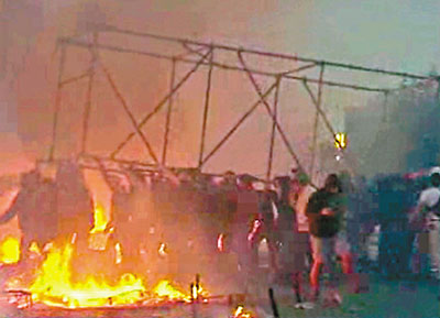 ■工會大樓遭縱火,民眾抬起鐵架協助被困人士逃生。 美聯社