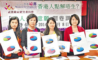 香港婦聯上月以問卷訪問500名市民,有59%受訪者表示願意生育,不願意生育則佔41%。未婚人士受訪者當中,不願生育的比率較高,達55%;已婚人士不願意生育率則為34%。同時,18歲至29歲受訪者當中,只有約52%願意生育。不願生育的主要原因是生活費昂貴(30%)、工作繁忙沒時間照顧(19%)、家中空間不足(16%)及缺乏家人支援(10%)等。