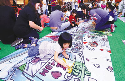大埔超級城昨日舉行「我愛大埔共迎母親節」活動,邀請近百名來自大埔區的家庭及青少年一同參與創作《敬愛母親大埔林村河祝願圖》百呎愛心巨畫,介紹大埔區內特色景物及生活文化。當中尤以大埔林村河許願樹世界聞名,畫中特別以象徵願望成真的許願樹向天下母親送上無限祝福,並讓父母與子女一起創藝同樂向媽媽致敬。