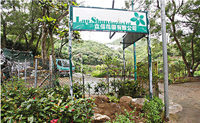 ■西貢大網仔路花圃被掘走的兩米高羅漢松種在門口牌扁之下。