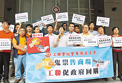 領匯於本月12日公告,以私人招標方式出售5個公屋及居屋商場,包括藍田興田商場、香港仔華貴商場、葵涌葵興商場、筲箕灣東熹苑商場及深水囃_熙苑商場,今日截標。工聯會代表及領匯商場租戶,昨日到政府總部請願。