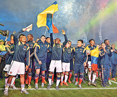 ■哥倫比亞國家隊於首都波哥大舉行出師儀式,接受民眾的祝福,有球迷期望前鋒法卡奧能趕及傷癒。 法新社